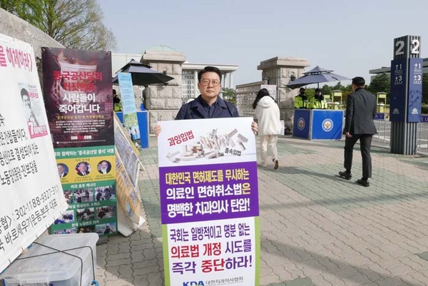 대한치과의사협회 진승욱 기획·정책이사가 오늘(10일) 국회 앞에서 ‘의료인 면허취소법’을 규탄하는 시위에 나섰다.