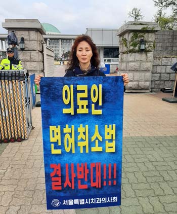 서울시치과의사회 한송이 부회장이 오늘(11일) 국회 앞에서 ‘의료인 면허취소법’ 반대 1인 시위에 나섰다.