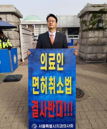 서울시치과의사회 정기훈 SIDEX 사무총장이 오늘(13일) 국회 앞에서 ‘의료인 면허취소법’ 반대 시위에 나섰다.