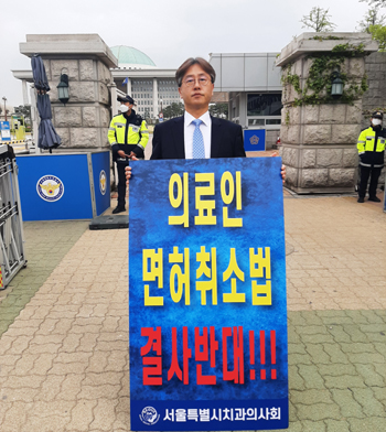 서울시치과의사회 함동선 부회장이 오늘(14일) 국회 앞에서 ‘의료인 면허취소법’ 반대 시위에 나섰다.