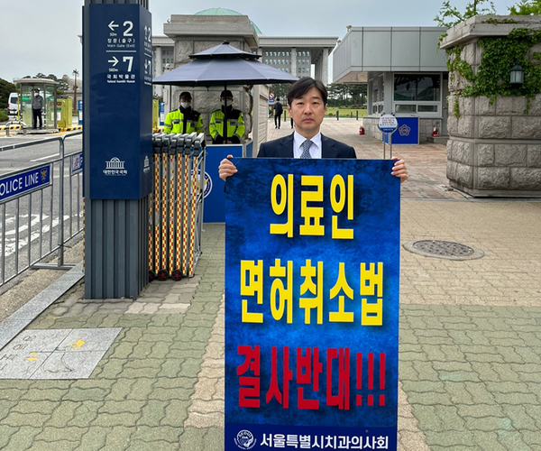 서울시치과의사회 정우혁 자재이사가 오늘(25일) 국회 앞에서 ‘의료인 면허취소법’ 반대 시위에 나섰다.