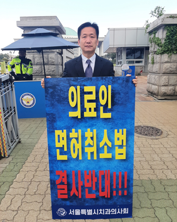 서울시치과의사회 차윤석 25개구회장협의회장이 오늘(26일) 국회 앞에서 ‘의료인 면허취소법’ 반대 시위에 나섰다.