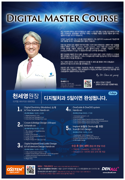 이번 디지털 마스터코스는 9월 마곡 오스템임플란트 연수센터에서 총 5회(6일, 7일, 20일, 21일, 27일)에 걸쳐 진행되며, 천세영(디지털 허브치과) 원장이 연자로 나선다.