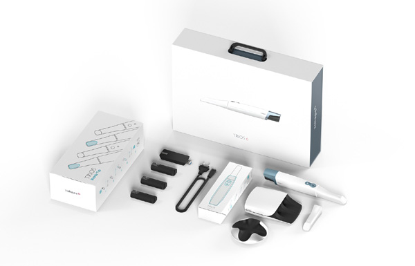 ‘TRIOS 6’의 구성품은 ▲TRIOS 6 본품 ▲교체용 배터리X3 ▲무선연결 리시버 ▲스캐너 거치대 ▲1회용 바디슬리브(1000개) ▲1회용 팁(25개) ▲충전기 ▲보호 커버 등이다.