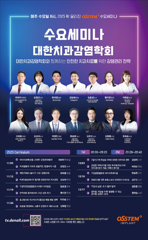 ‘안전한 치과치료를 위한 감염관리 전략’을 대주제로 펼쳐지는 이번 수요세미나 강연은 이달 5일 첫 방송을 시작으로 12월 17일까지 총 14개의 강연으로 구성됐다.