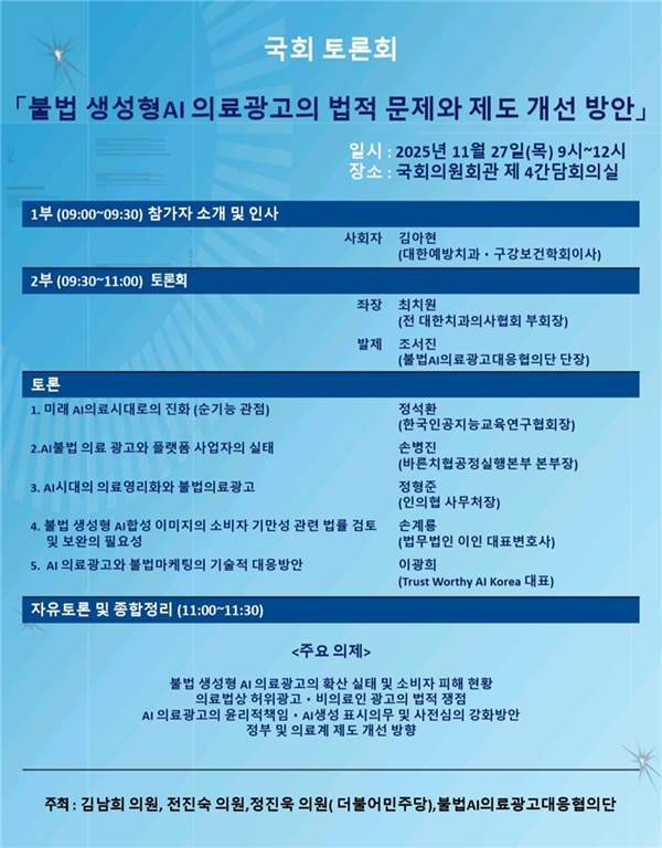 주요 의제는 ▲불법 생성형 AI 의료광고의 확산 실태 및 소비자 피해 현황 ▲의료법상 허위광고‧비의료인 광고의 법적 쟁점 ▲AI 의료광고의 윤리적 책임‧AI생성 표시의무 및 사전심의 강화방안 ▲정부 및 의료계 제도 개선 방향 등에 대해 다룰 예정이다.